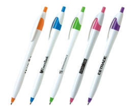 The Javalina Colors Available: Lime Green, Orange, Pink, Purple, Sky Blue Trim with White Barrels. Maximum imprint area: 1 1/2" x 3/4". One time screen charge of: $10.00. Standard production time is five days. Plus Ship Time Rush Service Availible! Blue or black ink cartridges available. Blue writing ink default unless otherwise stated