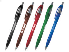 The Javalina Jewel Colors Available:  Silver Trim with Translucent Barrel Colors Sapphire Blue, Black Onyx, Mocha Diamond, Emerald Green , Ruby Red Maximum imprint area: 1 1/2 " x 3/4". One time screen charge of: $10.00. Standard production time is five days Plus Ship Time. Rush Service Available! Blue or black ink refill cartridges available. Blue writing ink default unless otherwise stated